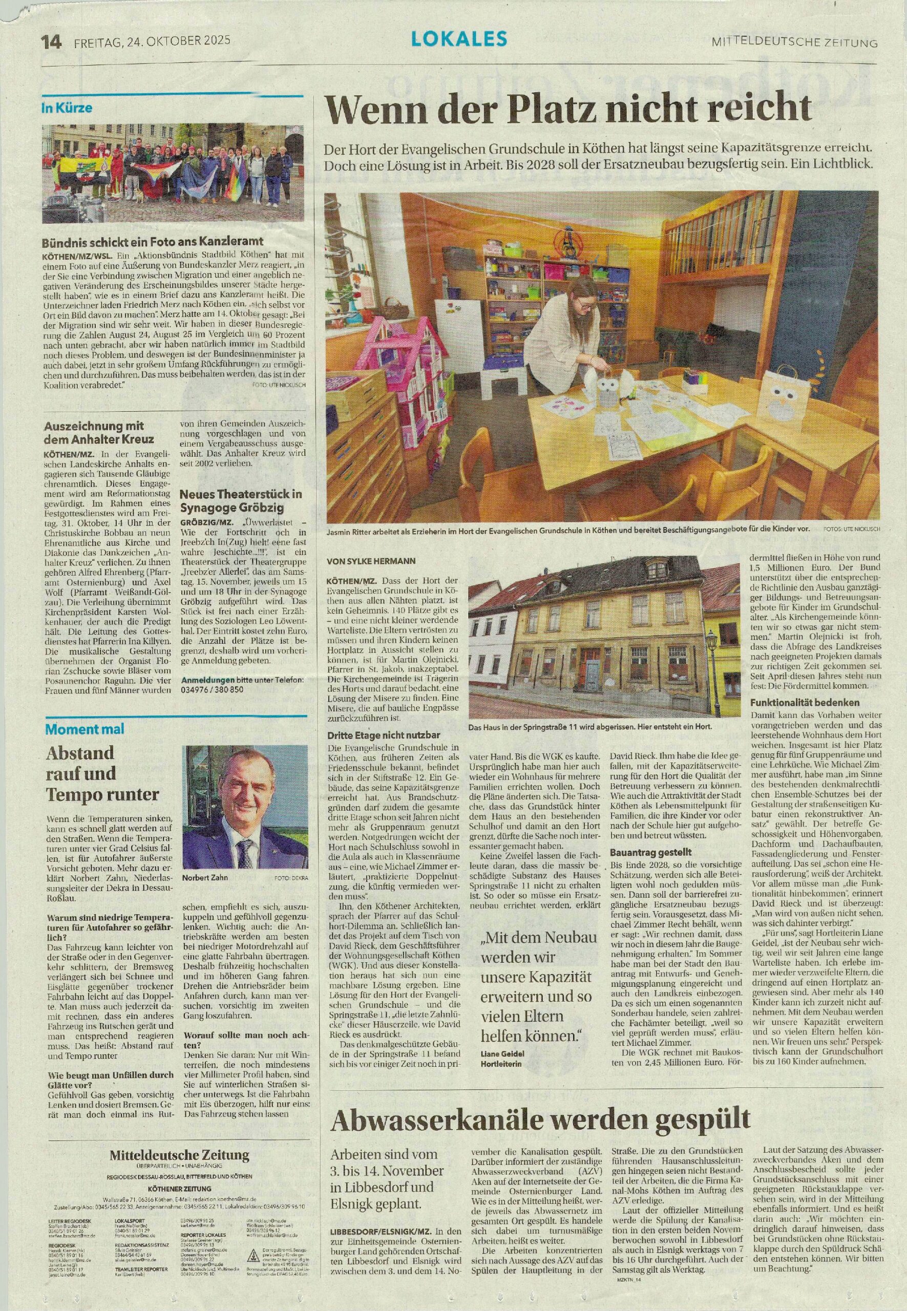 Ein neues großes Projekt startet. Die evangelische Grundschule in Köthen bekommt einen neuen Hort. Gemeinsam mit der Wohnungsgesellschaft Köthen und der evangelischen Kirchengemeinde St. Jakob wird das Bauprojekt umgesetzt. Der Bauantrag ist durch uns eingereicht und Ende 2028 soll laut Schätzungen der barrierefreie Ersatzneubau fertig sein.